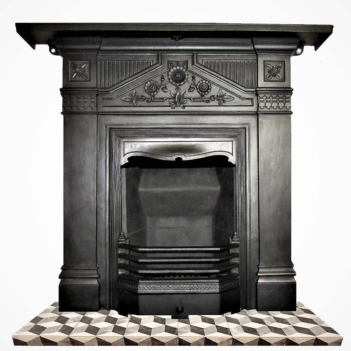 Reference: AI153 - Victorian cast iron original antique fireplace complete with firback, grate and ash cover. Finished in a traditional black polish. Opening Grate size 18" .