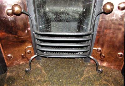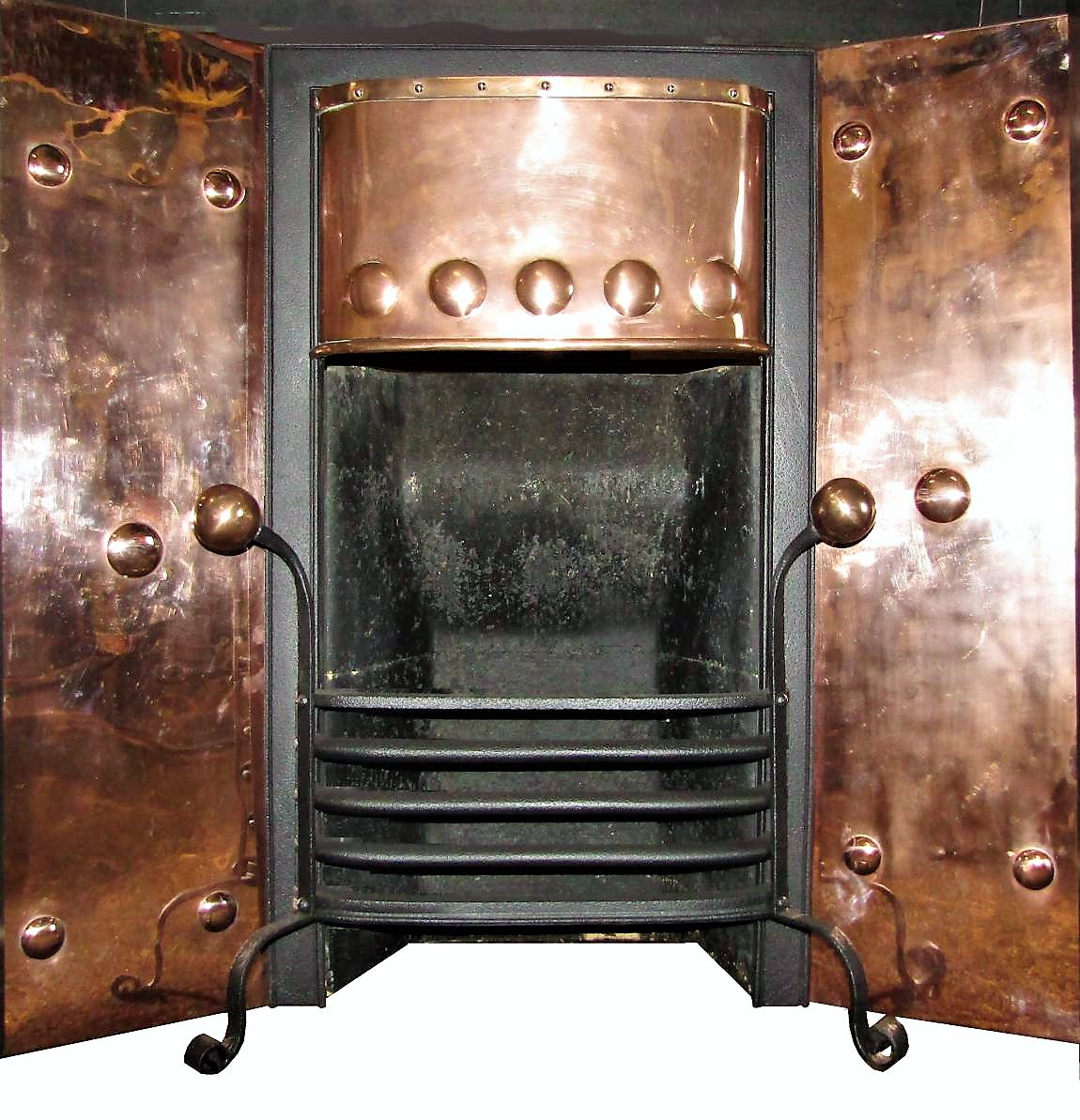 Reference: ATI643 - Antique Arts and Craft Copper tiled insert and bars. Decorative crafted hood and artistic copper and cast iron scrolled front bars. Complete with a clay fireback grate and ash cover for solid fuel. The width can be adjusted from 38 to 42" maintaining a 14" depth. Tiles are extra so please choose from our selection on the antique tile page. This insert can be sold without tiles leaving you to fit your own tiles. Inserts can be used for solid fuel or a living flame gas fire , which we can supply.
