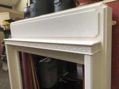 Reference: AWS 1104 - Antique 1930s painted wood surround with attractive lower shelf supporting simple pillars and classic strap work molding under shelf