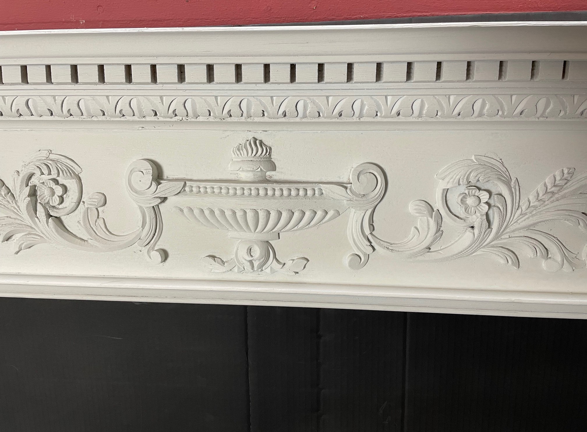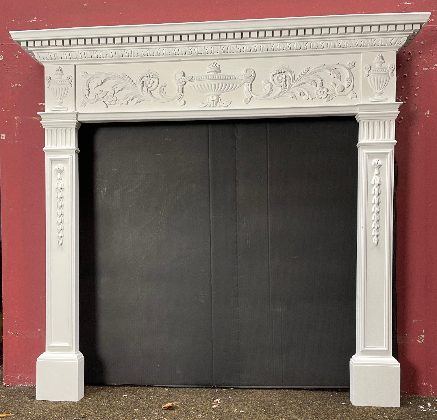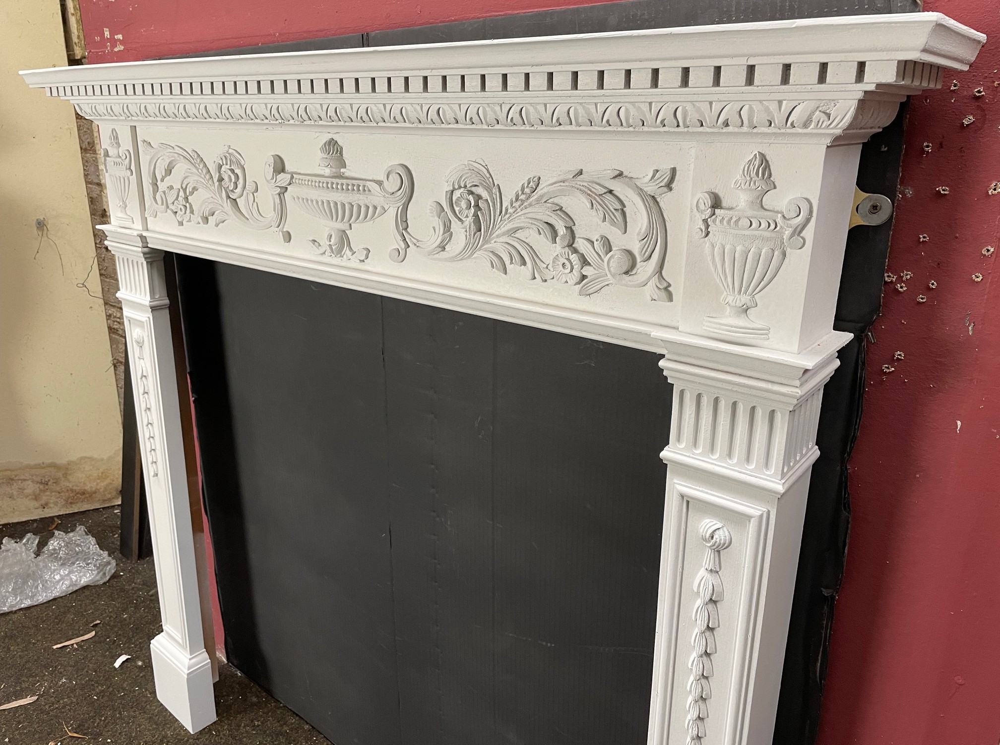 Reference: AWS 1164 - Vintage Georgian style wood fire surround in a primed finish with a most adorable classic Georgian design incorporating dental moulding plus egg and dart detailing under shelf. Classic urn and floral features on end tablet and across the frieze plus fluting and droplet on the legs. Very, very attractive and will grace any period room.