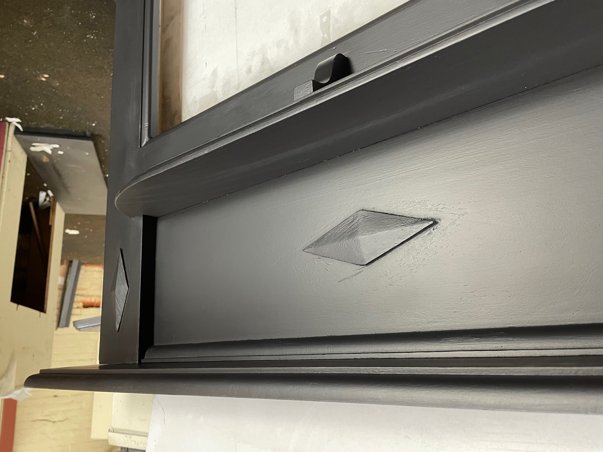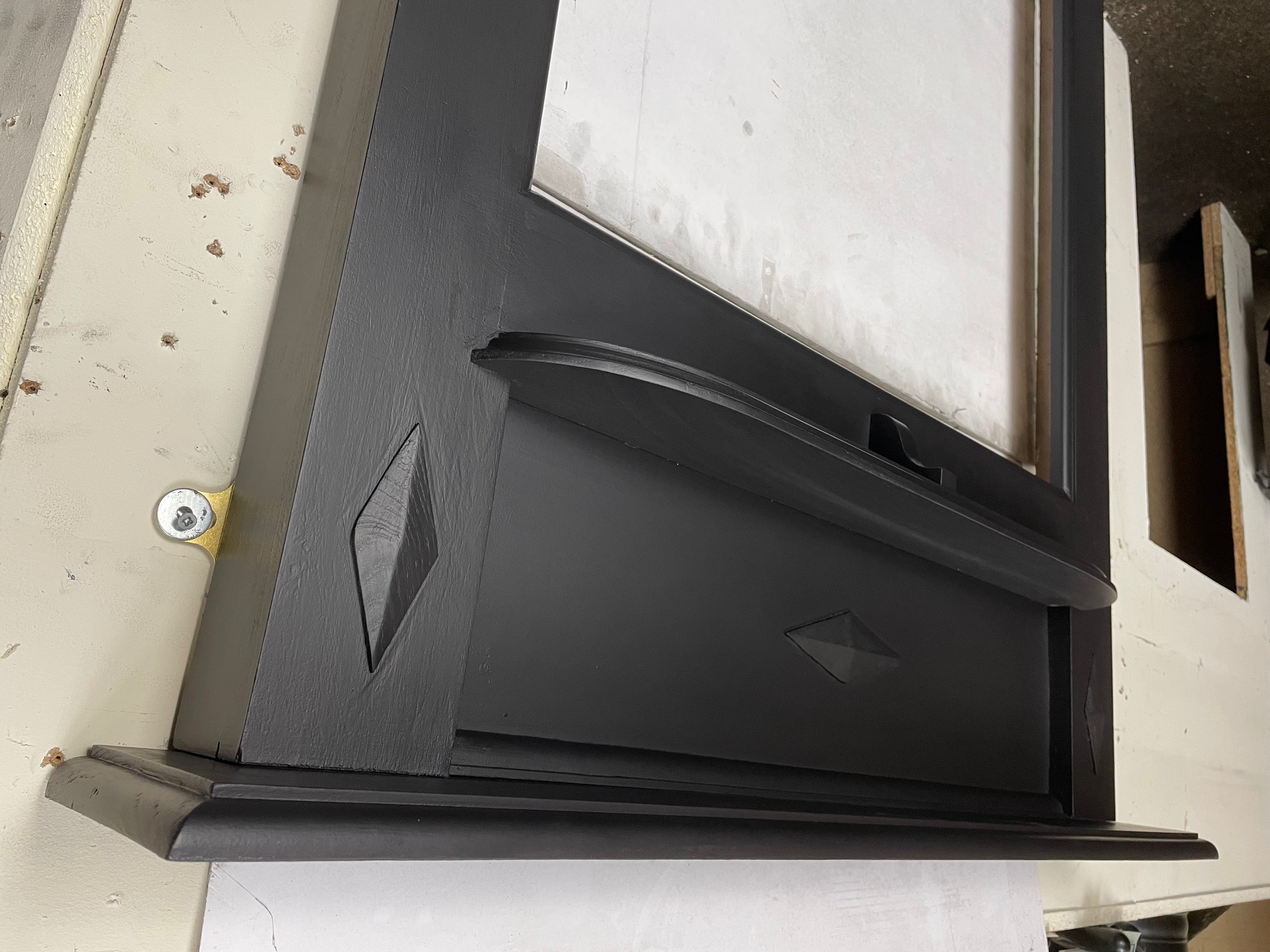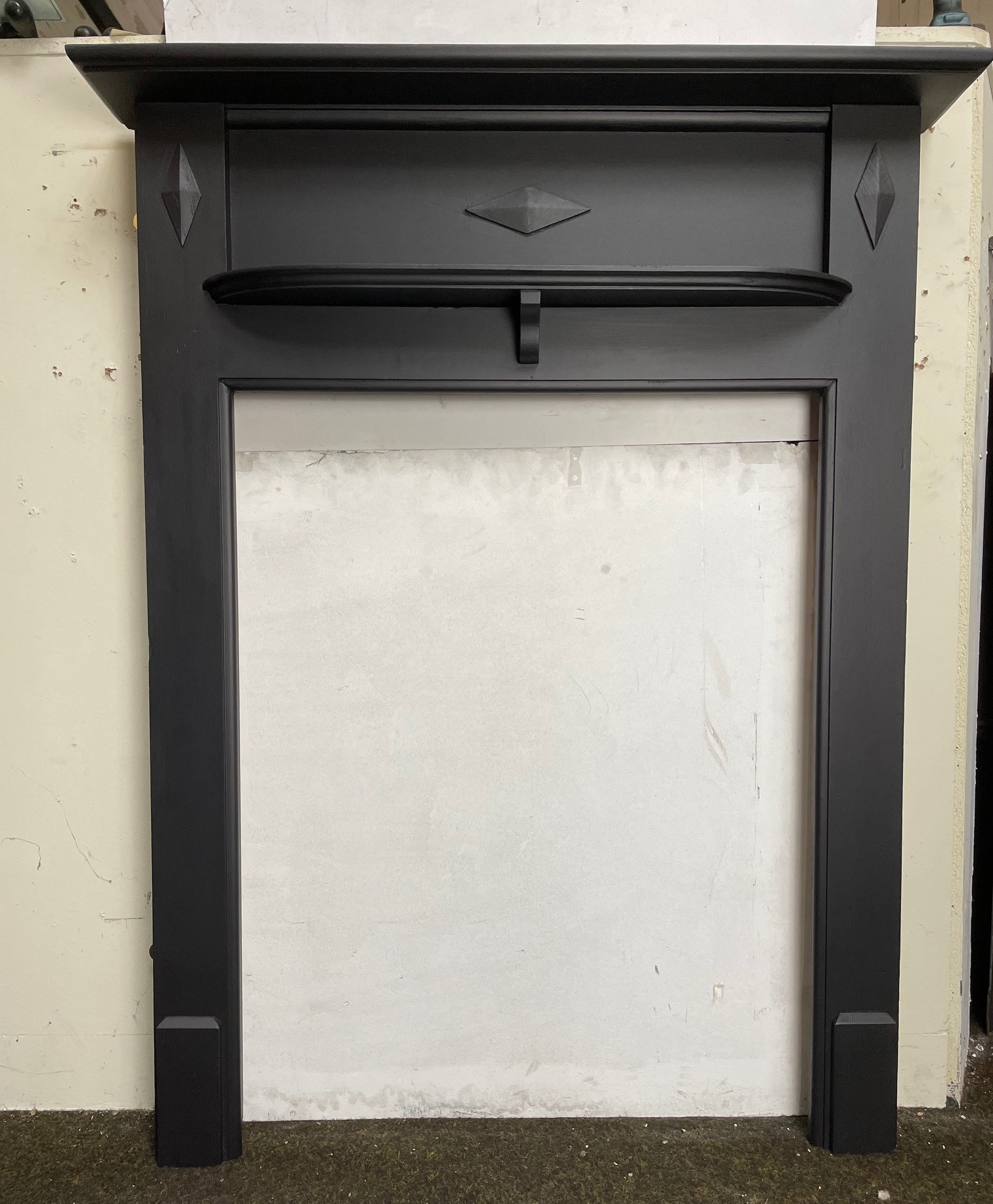 Reference: AWS 1167 - Original antique 1920's/ 1930's Art Deco design wood fire surround . Small delicate features with slender legs and diamond motif in the centre and at each corner Finished in a black sheen finish giving it a classy look for that period interior