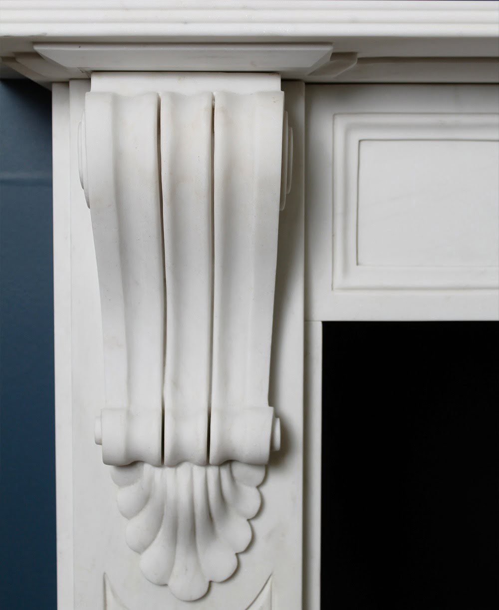 Reference: ABB 1101 - The Quenby marble fireplace surround has finely carved corbels, panelled legs and frieze, and a reeded shelf.